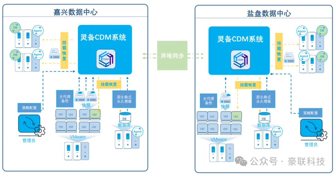 采購兩套靈備CDM系統(tǒng),分別部署在樂清鹽盤數(shù)據(jù)中心和嘉興數(shù)據(jù)中心。配置全閃存儲池和大容量存儲池,全閃存儲池用于核心業(yè)務(wù)數(shù)據(jù)庫的備份和掛載恢復(fù)再利用,大容量存儲池用于其他業(yè)務(wù)數(shù)據(jù)庫和虛擬機的備份和即時恢復(fù)。同時,在有限的專線帶寬下,實現(xiàn)兩套靈備CDM系統(tǒng)之間實現(xiàn)相互異地數(shù)據(jù)同步,做到數(shù)據(jù)的異地備份及異地恢復(fù)。