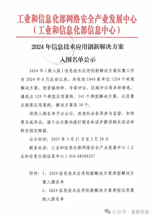 在信息技術(shù)應(yīng)用創(chuàng)新的浪潮中,浙江豪聯(lián)信息科技有限公司憑借卓越的技術(shù)實(shí)力和創(chuàng)新能力,成功入選工業(yè)和信息化部網(wǎng)絡(luò)安全產(chǎn)業(yè)發(fā)展中心(工業(yè)和信息化部信息中心)公布的 2024 年信息技術(shù)應(yīng)用創(chuàng)新解決方案入圍名單!這不僅是對(duì)豪聯(lián)科技過(guò)往努力的高度認(rèn)可,更是公司在信創(chuàng)領(lǐng)域邁向新征程的重要里程碑。